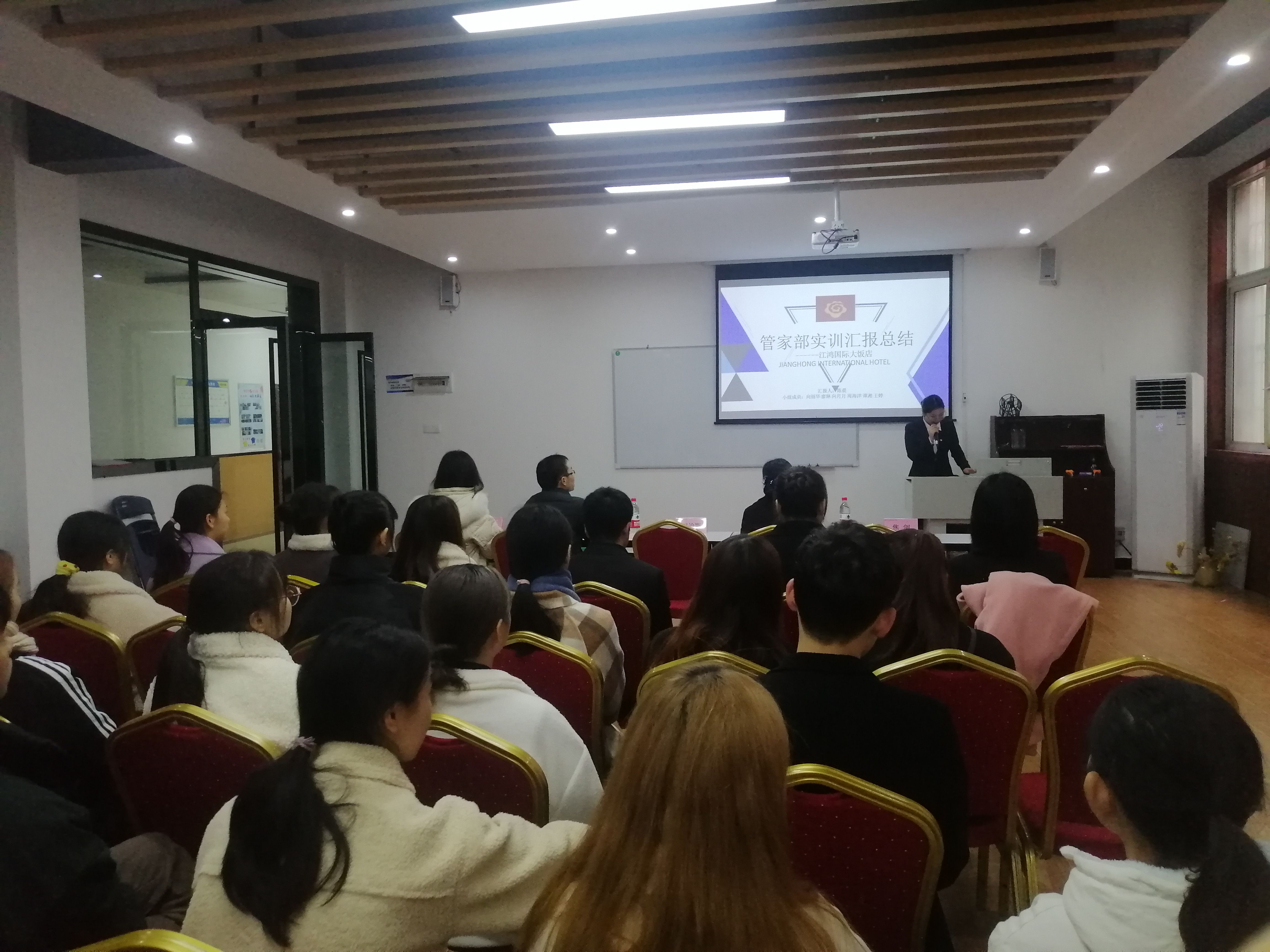 会上,柏天酒店和江鸿大饭店的汇报同学对酒店实训进行了汇报,客房部和餐饮部的同学们都讲述了在工作岗位上细节要求和学会的工作技巧以及工作体会。最后焦剑主任对同学们的汇报情况进行了点评,他表示,同学们要带着问题去做事才能要更大的进步。