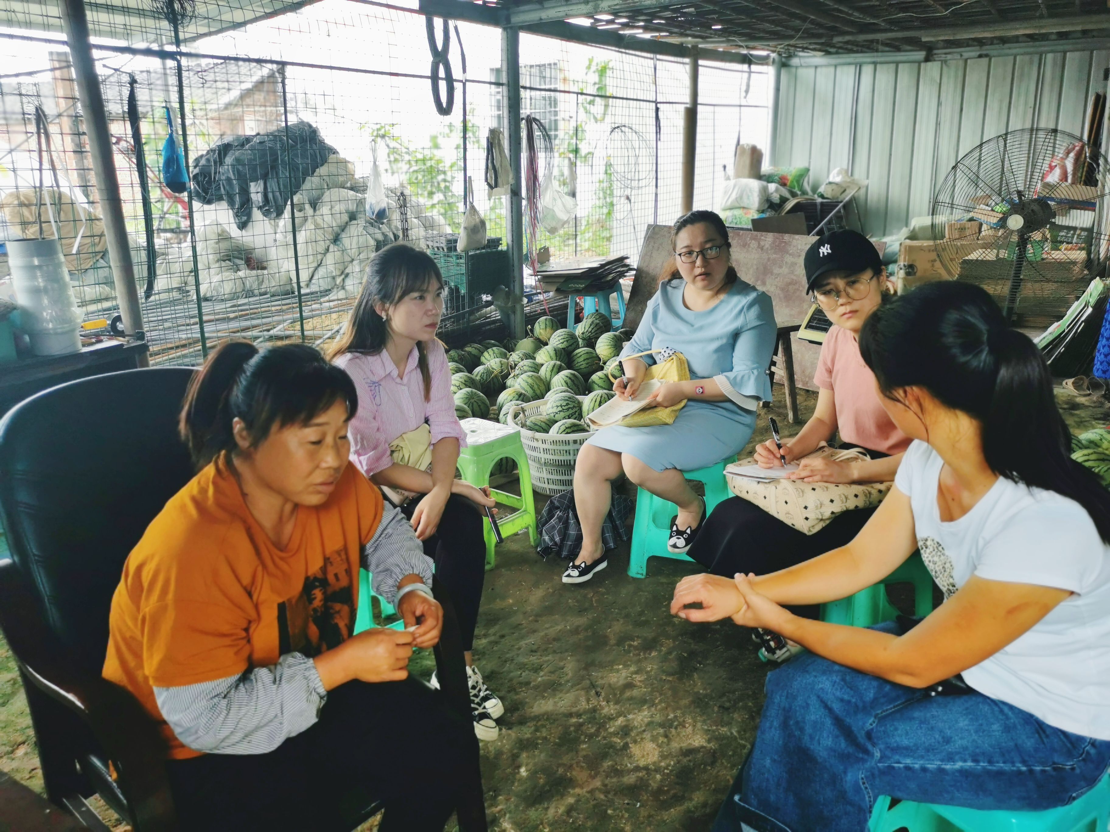 课题组首先参观了新建村的专家大院,初步了解了新建村乡村振兴项目发展的概况及规模;然后深入到了五间镇新建村的西瓜种植腹地进行了参观,并与各农户进行了深入交谈,了解到了农户们的发展需求和发展变化;最后采取了座谈交流的方式,在邓成芳主任处知悉了五间镇休闲农业的发展历史、发展现状及发展模式等,并就发展中所面临的困境进行了深度地探讨,达成了共识。