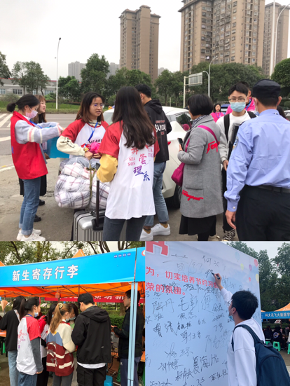 迎新工作如火如荼 虽中间有一些小插曲,天上下着小雨但丝毫不影响我们工作,反而看见到处都是忙碌的身影。志愿者热情地迎接着新生,耐心地回答着他们提出的各种问题。不少志愿者主动帮着拎行李,新生细声地叫着“学长学姐”,老生们也开心地介绍这介绍那。